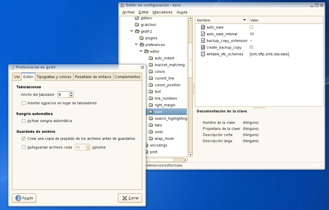 Podemos comprobar en la siguiente captura de pantalla cómo a través de gconf-editor tenemos disponibles parámetros que no son accesibles a través del diálogo de configuración estándar, como la extensión que se añade a los archivos donde se realiza una copia de seguridad o los protocolos gestionados por GNOME-VFS que queremos que realicen copias de seguridad.