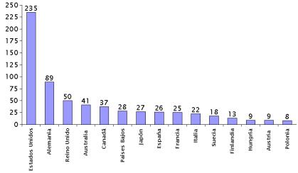 La primera gráfica, casi obligada, es la distribución de desarrolladores por países de residencia. Podemos observar (no sin cierta satisfacción) que España ocupa el séptimo lugar, un puesto que nos coloca a la cabeza de los países involucrados en el desarrollo de Debian.