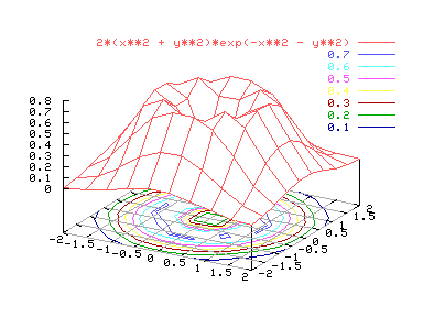 splot [-2:2] [-2:2] 2*(x**2 + y**2)*exp(-x**2 - y**2)