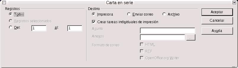 En el pequeño cuadro de diálogo que aparece, tenemos una dos series de opciones agrupadas. En la primera serie, de la izquierda del cuadro, llamada Registros, debemos indicar nuestras preferencias de impresión de los registros, y en la serie de la derecha, llamada Destino, si queremos que se imprima directamente, enviarlas por correo electrónico o guardarlas todas en un archivo.