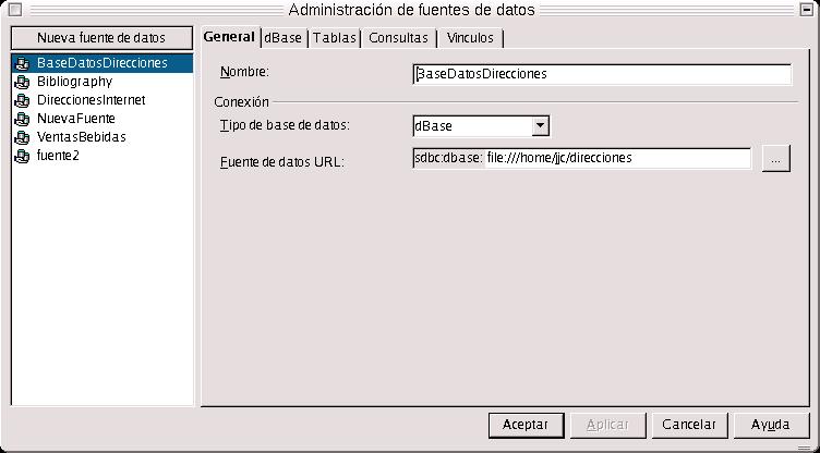 Nos aparecerá un cuadro de diálogo, y entonces para crear una nueva base de datos, pulso sobre Nueva Fuente, escribo el nombre de la fuente nueva, y posrteiromente selecciono como tipo de base de datos dBase. En el campo de más abajo, debo indicar la ruta del fichero, es decir dónde va a estar situado el fichero. Previamente, lo he tenido que crear desde la consola de comandos con mkdir.