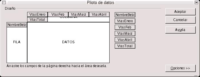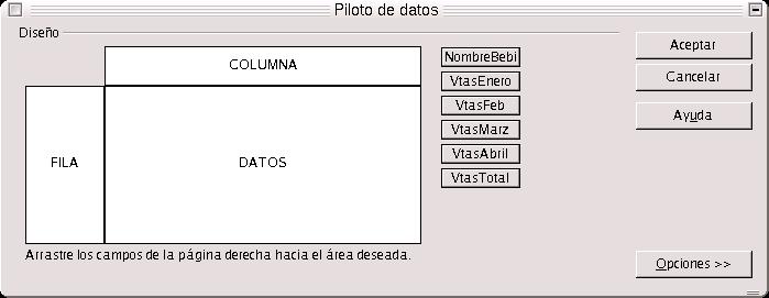 Para trabajar con el Piloto de Datos, nos vamos a Datos, desde Calc, y seleccionamos la base de datos y la consulta con la que queramos trabajar. Una vez hecho esto nos aparece una ventana, en la cual hemos de indicar el diseño que deseamos para los datos que se pasarán a Calc. Arrastraremos los campos de la consulta al área de fila o al de columna, según el caso, para pasarlos a Calc. Podemos hacer clic en el botón de opciones, y en este caso aparecerán las relativas al resultado a mostrar. Podemos agregar totales a columnas y cilas, también indicar si se desea la consulta en una nueva hoja o en la actual. Podemos indicar la columna-fila a partir de la cual iniciar la importación de los datos, e importar varias veces los datos para observar los resultados de las diferentes combinaciones.