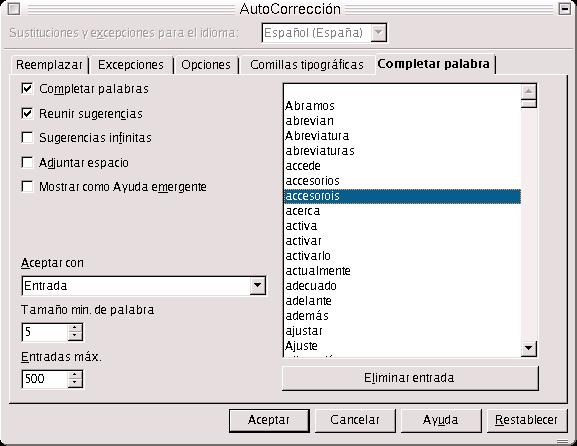En la ficha Completar Palabra, tenemos una serie de opciones y un listado de plabras que pueden completarse cuando se empiezan a escribir. Si nos damos cuenta, cuando estamos escribiendo una palabra, el Writer la puede autocompletar. Para ello, simplemente escribimos las dos otres primeras letras de la palabra y pulsamos return: Ejemplo: probar con la palabra Escriba, Español, Configuración, etc.. Writer nos da la posibilidad de completar una palabra sin tener que escribirla entera. Esto se activa en Herramientas --> Autocorrección --> Completar Palabra, en la casilla de verificación Completar Palabras. La palabra a autocompletar ha de estar incluída dentro de la lista de palabras que aparece en la ficha.