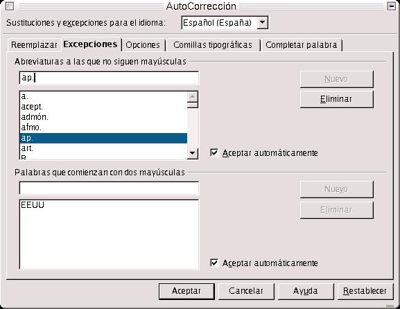 Un error ortográfico que suele cometerse frecuentemente es la introducción de dos caracteres iniciales en mayúscula o caracteres en minúscula al comienzo de una palabra o frase. Esto, naturalmente, lo corrige el Writer de forma automática. Si los hemos introducido correctamente, debemos añadirlos en la ficha Excepciones-->Palabras que comienzan con dos mayúsculas. Es decir, hay que indicarle al Writer que ciertas palabras o abreviaturas comienzan siempre por minúscula o que comienzan con dos letras mayúsculas.