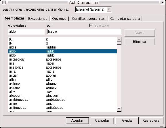 Con el documento Hiperenlace1.sxw abierto, nos vamos a Autocorrección-->Reemplazar, y añadimos una serie de palabras en Reemplazar, como se expuso antes.