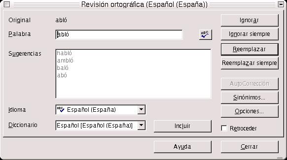 Podemos reemplazar la palabra por cualquiera de las que se nos ofrezcan en el cuadro de diálogo, por la que creamos más correcta. Podemos, a su vez, incluir la palabra dentro del diccionario de Español del OpenOffice.org, haciendo clic en el botón incluir. Con esto contribuiremos a incrementar el número de palabras del diccionario y a enriquecerlo.