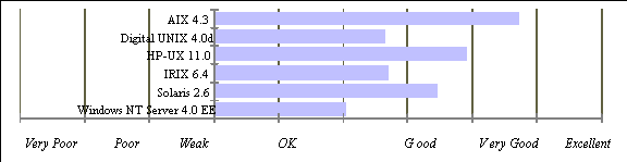 Cuando vamos a unas capacidades de red más sofisticadas, parece que Microsoft's NT Server 4.0 Enterprise Edition no puede compararse a los más maduros sistemas operativos UNIX. Aunque no es esencial para el rendimiento de la red, el procesamiento a 64 bits está aquí hoy con estos sistemas operativos UNIX (en oposición a los 32 bits del NT). D.H. Brown Associates Inc. muestran los resultados de sus análisis como sigue (la siguiente cita junto con la tabla y los tres gráficos mostrados con extractos de la página de Digital Equipment Corporation, AIX 4.3 Leaps To 64-Bits In Dead Heat With Digital UNIX 4.0):