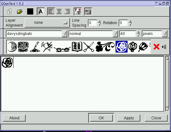 Probably you have already come across dingbats when you used the text tool of Gimp. Dingbats are fonts. When you were trying out several fonts you probably came across some fonts called e.g. dingbats, davysdingbats or davysotherdingbats that weren't normal letters but small sketches of flowers, a piano, animals etc. Perhaps you have wondered then what you could do with them. But usually when you are using the text tool you want to include some text and later when you are looking for cool motives you have already forgotten about them. But think again. They can really help you create very nice looking pictures in a short time and you also don't need to be very talented in drawing for this.