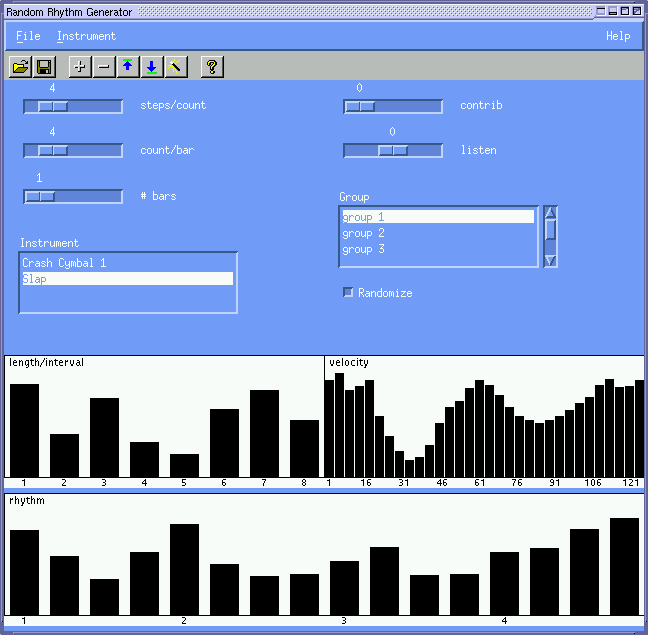 You can also define groups of instruments to make the different drums play a bit more together. This is what you see on the right side of the dialog box of the random rhythm generator. Note that you have to define a contributor before a listener.