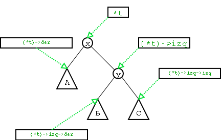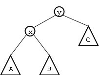 Miremos por un momento el árbol de Figure 3. Dado que este es un árbol de búsqueda se debe cumplir x < y y además todos los nodos del subárbol A deben ser menores que x y y; todos los nodos del subárbol B deben ser mayores que x pero menores que y; y todos los nodos del subárbol C deben ser mayores que y y por lo tanto que x.