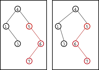 Como podemos observar, el resultado luego de la rotación es un árbol AVL: posee tanto el órden correcto de un árbol de búsqueda entre sus nodos y la propiedad de equilibrio. En este caso el "desequilibrio" en el árbol con raíz 5 era enteramente hacia la izquierda y por lo tanto, como ya dijimos, la rotación efectuada se denomina rotación simple izquierda. En el caso de un "desequilibrio" hacia la derecha, la rotación es análoga y se denomina rotación simple derecha. En Figure 8 se ven dos árboles: el primero tiene un "desequilibrio hacia la derecha" marcado en rojo y el segundo es el resultado de aplicar una rotación simple derecha.