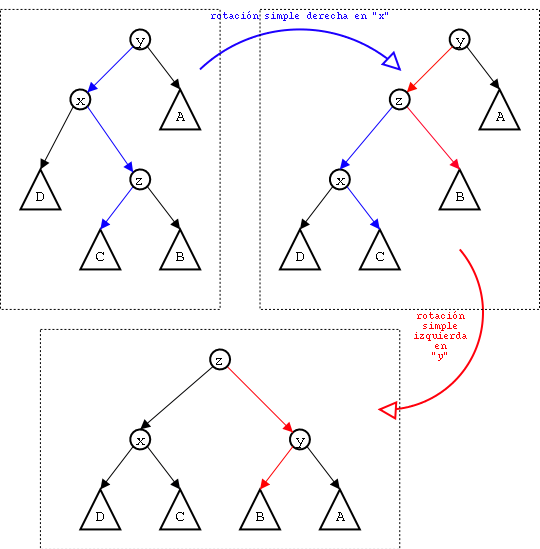 Ilustración de la operación rotación simple. en Figure 9 se ilustra la operación rotación simple. Los arcos de colores son los que se eliminan o agregan, según sea la rotación izquierda o derecha.