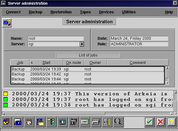 Como hemos visto antes, Arkeia utiliza una GUI en el servidor. Se entra en Arkeia con una ventana de login que permite el acceso a las ventanas específicas que administran el almacenamiento. Estas ventanas se pueden abrir desde un menú, un menú contextual o pinchando en iconos. Todo eso puede ser configurado según los propios gustos (fondos de pantallas predefinidos, colores preferidos). No hay mucho más que decir, puesto que todo es evidente y muy amigable. En Unix, el GUI funciona con casi todos los gestores de ventanas. En las cosas de Microsoft, tendrán que instalar la JVM (Java Virtual Machine) del mismo Microsoft antes de poder utilizar el GUI. Para concluir, el GUI es muy práctico, les guste su aparencia o no.