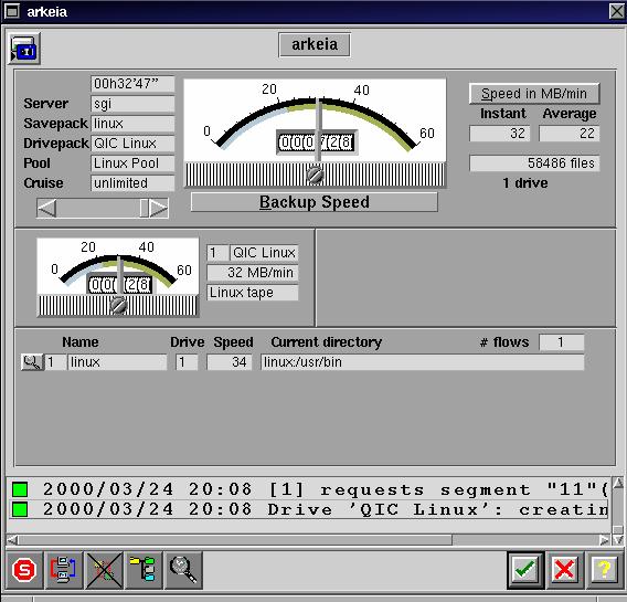 No obstante, una manera interesante de entender la eficiencia de Arkeia es comparar con la estrategia precedente con el mismo hardware. Antes de utilizar Arkeia, los almacenamientos se hacían desde cada ordenador, con cada streamer conectado al puerto SCSI. Hablando de los mismos ordenadores y de los mismos streamers, el beneficio representa un 50%. Almacenamiento del Sun con su propio streamer: 1 hora; con Arkeia: 38 minutos. Almacenamiento de Pcdev con su propio streamer: más de 1 hora; con Arkeia: 32 minutos. Etc... No olvidemos almacenar el servidor de almacenamiento: ésta vez no usamos la red, y es un poco más lento (alrededor de 22Mb/min). Según Arkeia, con el hardware correcto, se puede almacenar 128 máquinas en 32 streamers en paralelo. No pude probar tal configuración... Donde trabajo somos muy pobres.