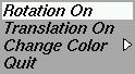 Notice that the main menu has two different types of menu entries. The first type (Rotation On, Translation On) actually changes when the requested action is executed. This means that after you launch the triangle into rotation mode, the next time you view the main menu it will read "Rotation Off". The other type of menu entry remains alway constant, like "Change Color", "Red", "Blue" and "Green".