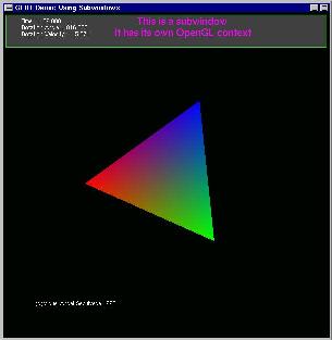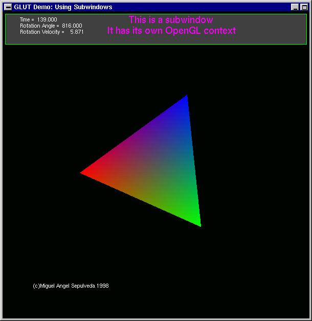 This demonstrates that menus are attached not only to events (left mouse button) but they are translated according to the current OpenGL context. We already mentioned in our previous article that a GLUT sub-window carries its own OpenGL context, here we see another consequence of that fact. Two menus have been attached to the same event but different context. The developer then has a powerful tool to write a very sophisticated user interface for his/hers applications.