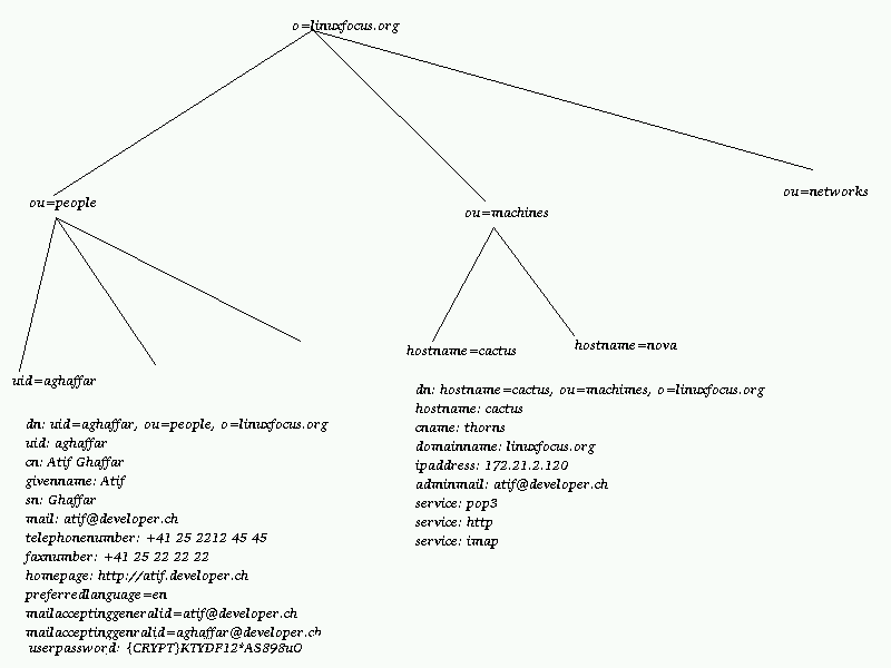 28. maildrop: Yine bu da mesaj sunucusu için. Kullanicilarin aktif mesaj adreslerini belirtir. Bu örnekte sunucu "mkempe@linuxfocus.org" adresi için mesaj alir, mesaj sunucusu daha sonra sunucu ile kontrol eder. ""mkekpe@linuxfocus.org" için mesaj kabul eden bir mesaj hesabi var mi?". Ldap sunucusu maildrop niteliginin degerini verecektir. Mesaj sunucusu bundan sonra mesaj hesabina mesaji yollar. Bir ISP altyapisini hazirliyorum ve sanal domainlleri (virtual domains), ve bu domainler için ve kullanicilari için gerekli tüm bilgiyi tutmasi için yogun olarak ldap sunucusunu kullaniyorum. Eger bu konu ile ilgileniyorsaniz bana bir mesaj atabilirsiniz.
