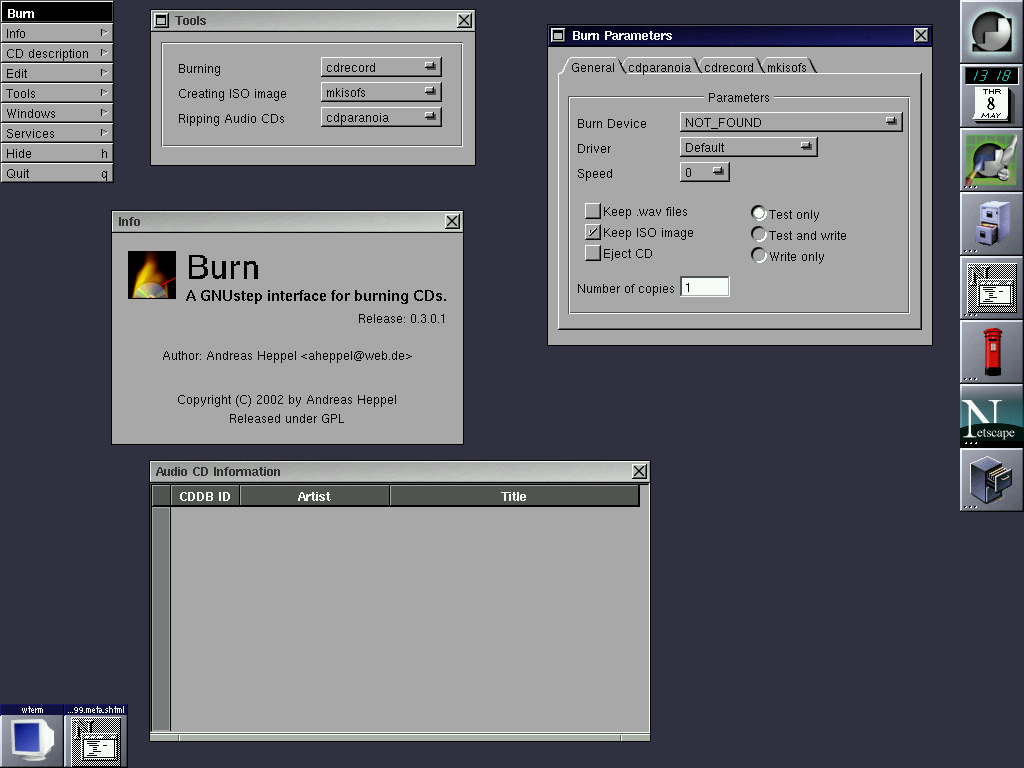 To use Burn.app you also need CDPlayer.app since its AudioCD.bundle reads the