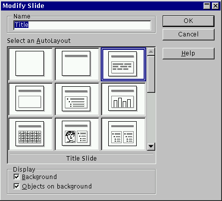 99% of all slides we write will have a very similar appearance: a title and then likely a list of text items. This task is very common thus having a simple mechanism to execute them would be a nice feature. Presentation allows us to pick a slide structure from a menu of possible common structures, and any slide structure can be modified at any time.