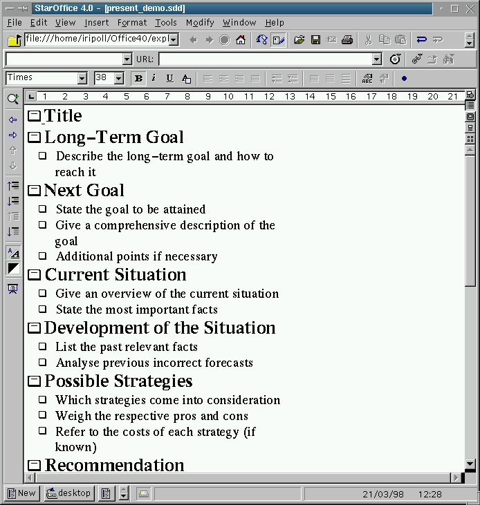 It's impossible to explore all features of StarOffice in a single article. Therefore I will begin this sequence with one of the applications that was the most necessary for me under Linux: the presentation editor, the PowerPoint of Linux.