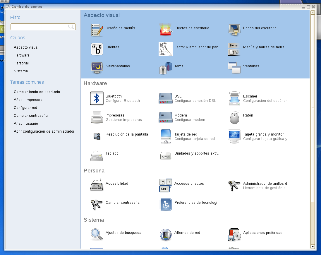 El Centro de Control, a pesar de ocupar poco espacio en el menú principal, lo cual se entiende porque no es algo que debiésemos usar muy a menudo, es una parte importante en nuestro escritorio. Es el método de realizar las configuraciones necesrias para que todo funcione y no tener que volver a usarlo. Para navegar por él, las diferentes opciones están divididas en categorías que podemos filtrar a través de la barra lateral o recurrir al campo de búsqueda.