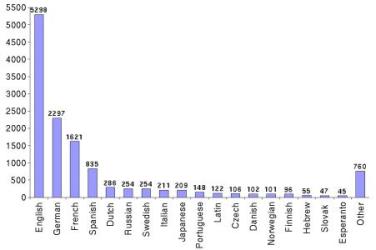 A continuación mostramos la distribución de las lenguas que los desarrolladores han indicado como sus lenguas maternas. El inglés es la lengua materna de alrededor del 50% de los desarrolladores de software libre. Además, se puede ver que gracias a la numerosa comunidad holandesa, el holandés se sitúa por delante del español.