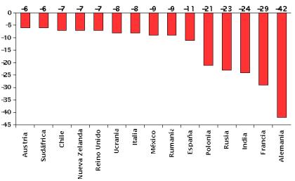 En el lado opuesto, los países que acogen en menor medida a desarrolladores que los que ven partir, se encuentran principalmente países europeos y la India. España alcanza en esta clasificación (más bien negativa, todo sea dicho de paso) su mejor posición a lo largo del todo el estudio, la sexta plaza.