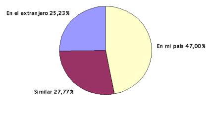 Ya que estamos preguntando a los desarrolladores por si situación laboral y el software libre, incluimos una pregunta para ver qué pensaban sobre las posibilidades de futuro del software libre en su país. La mitad de los desarrolladores encuestados opina que en su país hay más oportunidades que en el extranjero, mientras que un cuarto cree respectivamente que la situación está mejor en el extranjero o que es similar. La distribución de respuetas que los desarrolladores españoles nos dieron es muy parecida.