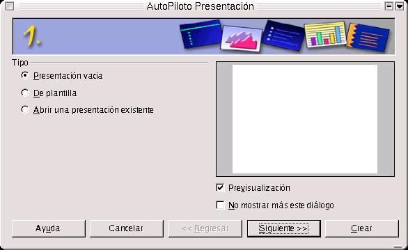 A su vez, podemos indicar en la casilla de verificación Previsualización, si deseamos que las plantillas de presentaciones se visualicen en un pequeño cuadro. Podemos también indicar en la casilla No mostrar más éste diálogo, si deseamos que no aparezca las próximas veces.