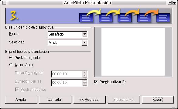 También le podemos indicar que la presentación sea automática, es decir que pase de una página a otra de forma automática, para lo cual le hemos de indicar la duración de cada página, la duración de las pausas entre diapositivas y si queremos que se muestre el logotipo de StarOffice en las pausas.