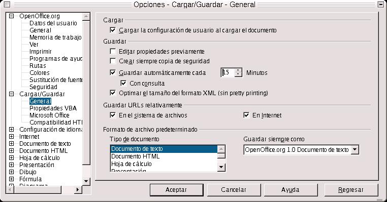 Ahora bien, surge una cuestión, y es si podemos hacer que el documento se guarde de forma automática cada cierto intervalo de tiempo, con el fin de salvaguardar de cierres inesperados del sistema, los cambios que se hayan producido en el documento. La respuesta es que sí. Para ello hemos de activar la casilla Guardar Automáticamente Cada, y definir el tiempo en minutos. Para hacer esto, hemos de irnos al menú Herramientas-->Opciones-->Cargar/Guardar-->General-->Guardar Automáticamente Cada, y definir el tiempo.