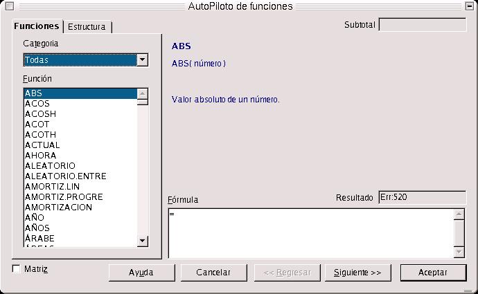 En el cuadro de diálogo, nos aparece en el campo combinado de Categorías, un listado de las categoría de funciones que se pueden ejecutar en Calc. Dichas funciones se clasifican en estadísticas, matemáticas, Matemáticas, Bases de Datos,Finanzas, Información, Fecha y Hora, Lógicas, etc..