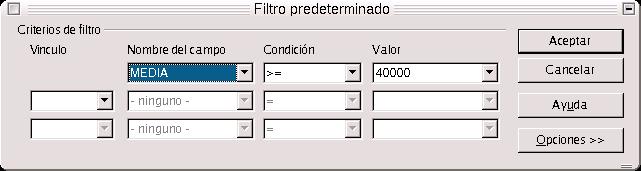 Para seleccionar como filtrado el estándar, quitamos primero el autofiltro, seleccionando el área y después yendo a Filtro-->Autofiltro. De esta forma hemos desactivado el autofiltro. Seleccionamos Filtro-->Filtro Predeterminado (o Estándar), y le ponemos el criterio de filtro que deseemos en el cuadro de diálogo, sabiendo cómo funcionan los operadores lógicos (O) y (Y). Para ver las opciones, pulsamos sobre el botón Opciones. La más importante de ellas es la que nos dice que podemos presentar el resultado del filtrado en otra zona de la hoja de cálculo. Para ello, hemos de seleccionar con el botón izquierdo presionado, la zona sobre la cual queremos que se presenten dicho resultado, y pulsamos en Aceptar.