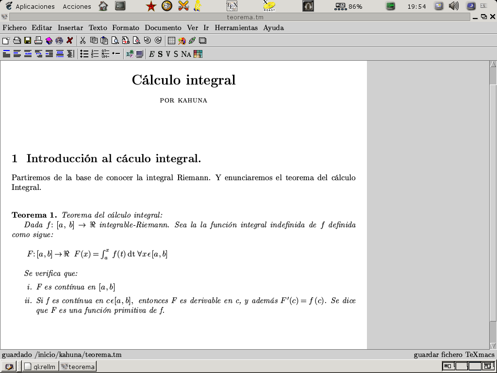 Crearemos el "Teorema". Hacemos clic en el icono "Teorema", y escribimos el teorema de fundamental del cálculo integral (por ejemplo :) Hay que tener en cuenta cuando debemos entrar y salir del modo "matemático" de TeXmacs. Es muy sencillo.