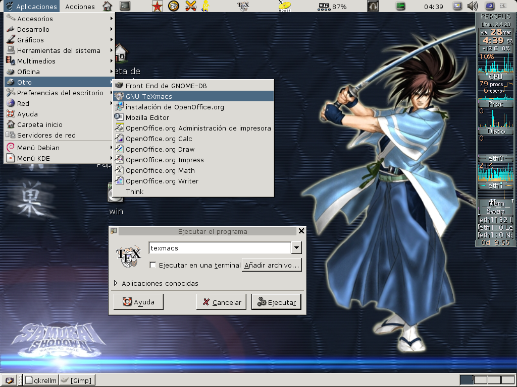 Para cargar TeXmacs desde GNOME hacemos clic en Aplicaciones -> Otro -> Gnu TeXmacs. O bien pulsamos ALT+F2 y escribimos en el cuadro de diálogo texmacs. En la siguiente captura de pantalla se puede ver.
