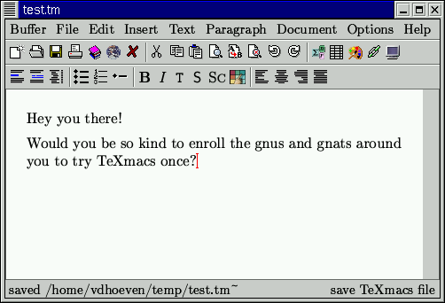 Una vez que le hemos dado nombre a nuestro documento, simplemente escribimos lo primero que se nos venga a la cabeza. Os daréis cuenta que es como escribir en un procesador de textos cualquiera, solo que TeXmacs es algo más que un procesador de textos.