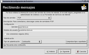 Vamos a aprender a configurar Evolution, luego, como ejercicio, puedes configurar Mozilla Mail. Necesitamos los datos de la configuración. Vamos a abrirnos una cuenta de correo en www.terra.es (pues ofrece una cuenta que puede ser usada mediante Web y mediante POP). Al final del proceso aparecen dos pantallas de datos, la primera son los datos para conectarnos a Internet con Terra y la segunda para configurar el correo POP. Los datos que necesitamos son: