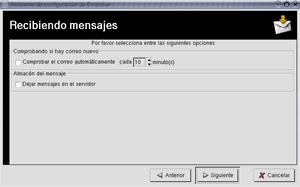 5. En la siguiente ventana podemos configurar un par de opciones adicionales. Podemos activar la primera, con lo cual Evolution comprobará cada diez minutos si nos ha llegado correo nuevo (podemos cambiar el tiempo). Si activamos la segunda (Dejar mensajes en el servidor), al descargar los mensajes no se borrarán del servidor, con lo que podemos volver a descargarlos. Hay que tener cuidado con esta opción pues puede saturarse nuestro correo.