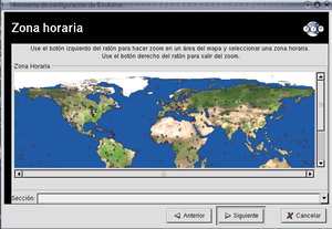 8. Seleccionamos ahora nuestra zona horaria haciendo click en la zona correspondiente del mapa o seleccionándola al desplegar la ventana inferior.