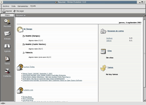 10. Y aquí tenemos la pantalla principal de Ximian Evolution. En la parte izquierda tenemos algunos enlaces que deben resultarnos familiares del correo web como la bandeja de entrada, los contactos (libreta de direcciones) o la agenda, además de Tareas y Resumen (que es la pantalla inicial, la que estamos viendo).