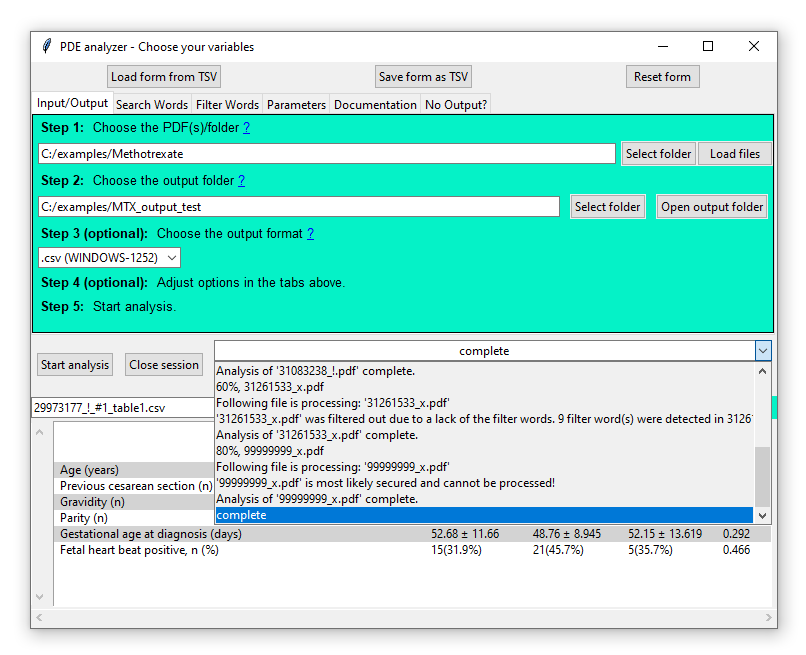 3. Extract tables: For the example we extracted all tables from the detected PDF (since each table had either the word Methotrexate or MTX in it). You can still press the button though to watch the program extract all tables into a new subfolder names extracted_tables which can be found in the PDF folder. NOTE: The table extraction only works when PDF file and TSV files are available.