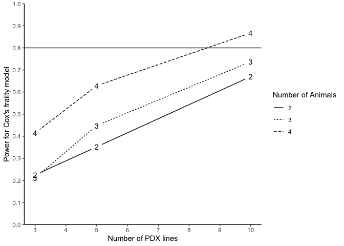 devtools::install_github("shanpengli/PDXpower")Below is a toy example how to conduct power analysis based on a