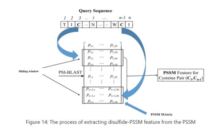 In the above equation, ’s, are the PSSM elements and ’s are the 20x20 matrix elements, which by placing the rows of this matrix next to each other, DPC-PSSM feature vector of length 400 is obtained.