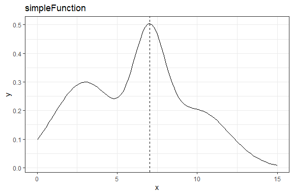 xmax <- optim(8,simpleFunction,method = "L-BFGS-B",lower = 0, upper = 15,control = list(fnscale = -1))$par