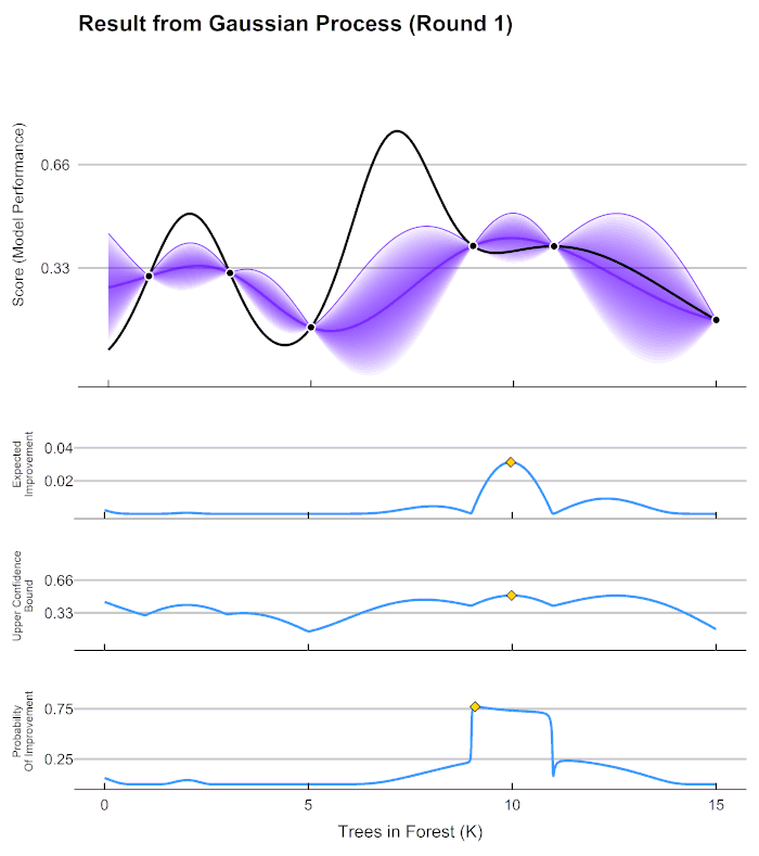 Before we can select our next candidate parameter to run the scoring function on, we need to determine how we define a “good” parameter inside this prior distribution. This is done by maximizing different acquisition functions within the Gaussian process. The acquisition function tells is how much utility there is at a certain unexplored space. In the chart above, the lower 3 graphs show examples different acquisition functions.