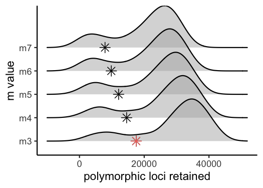 #> while the asterisk denotes the total number of loci retained at an 80% completeness cutoff. The optimal value is denoted by red color.