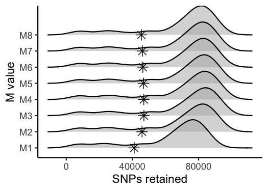 #> Visualize how different values of M affect number of polymorphic loci retained.