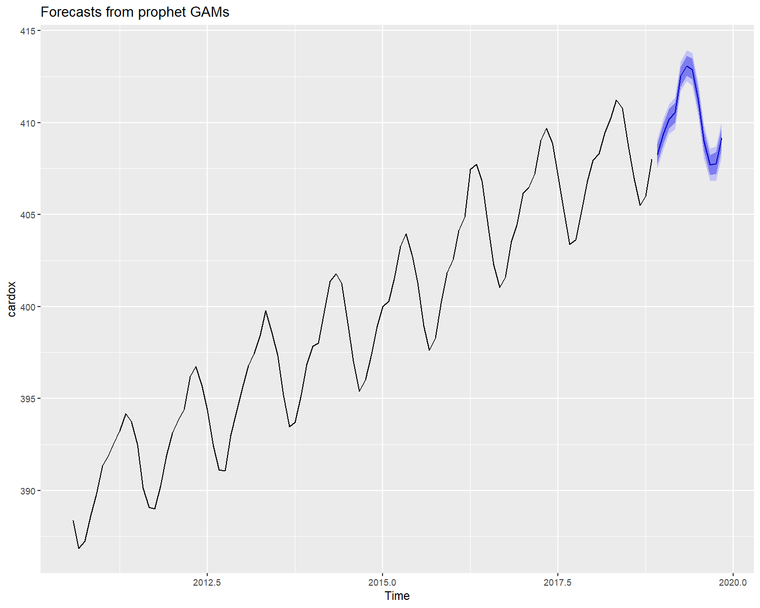 Additionally the forecast function is implemented for automatic forecast, by default a Generalized additive model from the prophet package is used.