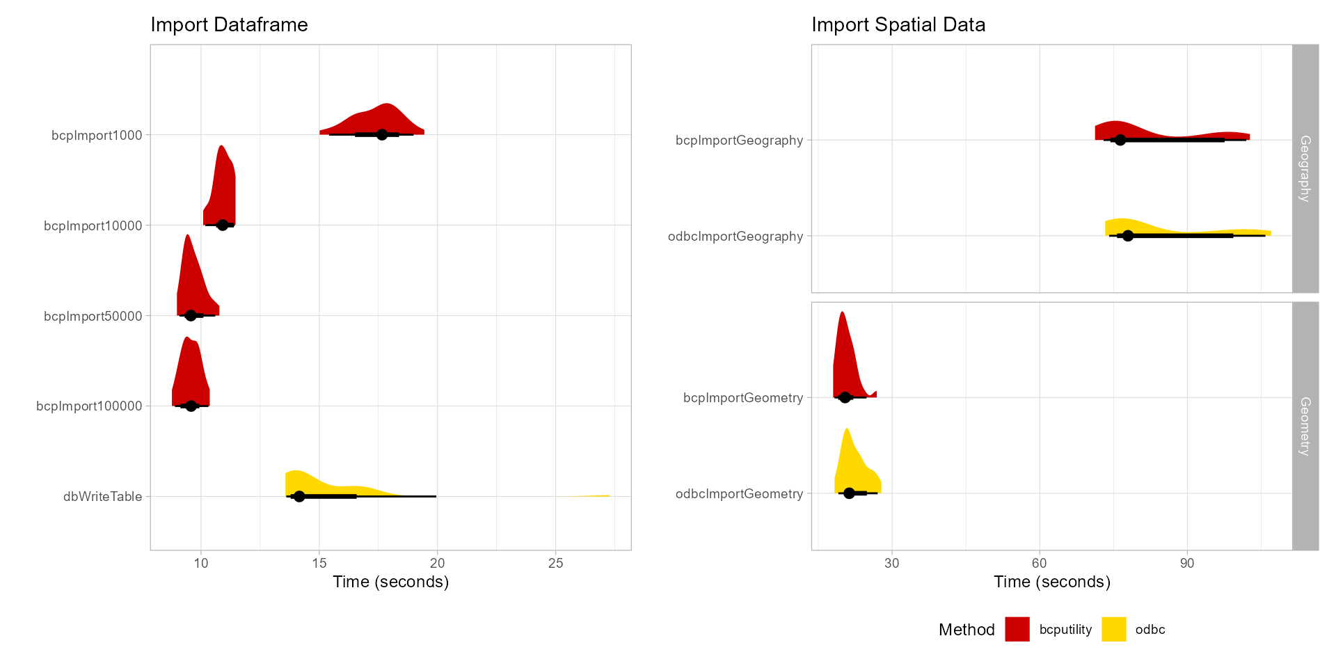 bcpImport(x = x, connectargs = connectArgs, table = table)Benchmarks were performed with a local installation of SQL Server Express. When testing with a remote SQL Server, performance of bcp over odbc was further improved.