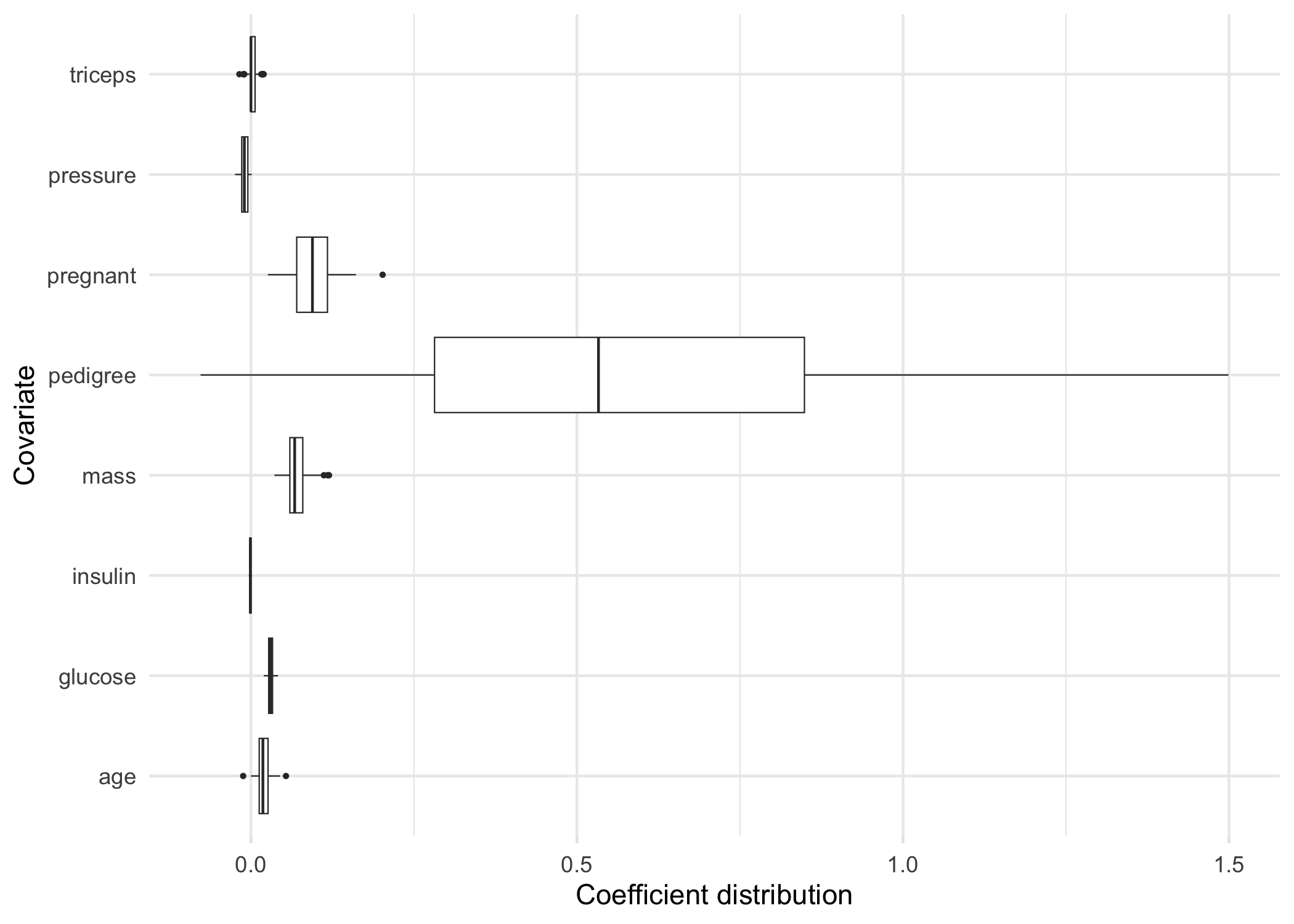 #> 16 triceps VIP 0.69 0.31 4bolasso also supports moving beyond variable selection and understanding the bootstrapped variable coefficients. We can extract a tidy tibble where each variable is a column, and each row represents a bootstrap fold, and the values are the corresponding estimated coefficients.